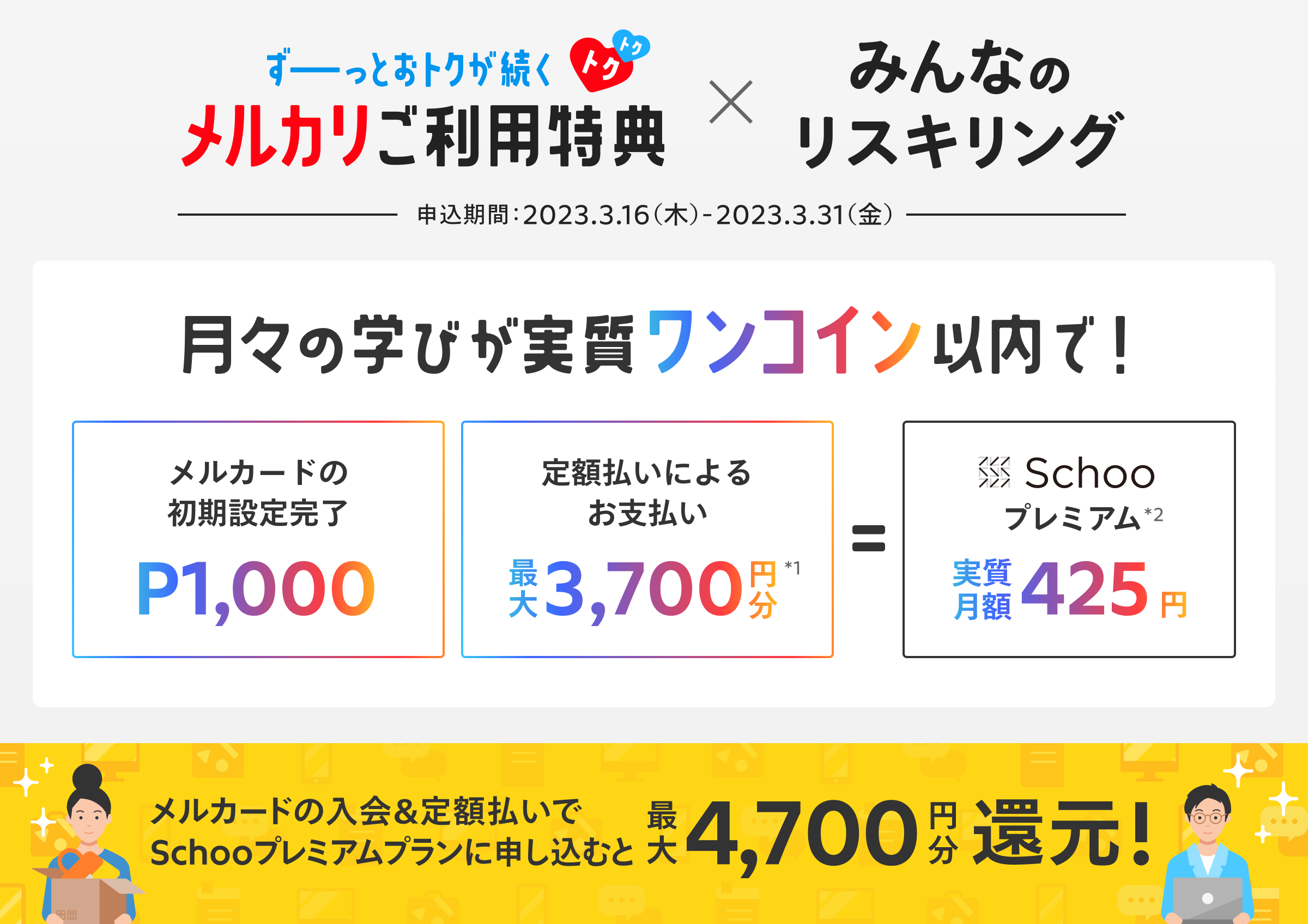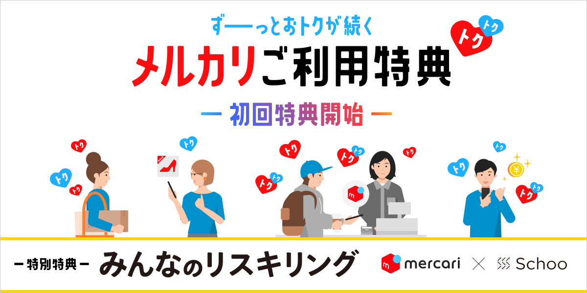 また、特別特典としてスクーと共同で、「みんなのリスキリング」の提供を開始いたします。本特典と「メルカリご利用特典」の初回特典をご活用いただくことで、スクーの提供するオンライン学習サービス「Schooプレミアム」の年間プランをメルカードで決済し定額払いでお支払いすると月々の学びが実質月額ワンコイン以内でうけることができます。