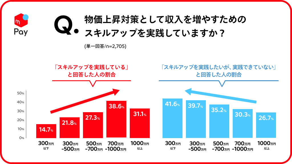物価上昇下でのリスキリングについて、当社が実施した調査(※2)では「スキルアップを実践したいけど実践できていない」と回答した人に対して実践できない理由を訊いたところ、約73.6%の人が「お金に余裕がない」と回答しており、物価高の影響で家計負担が増える中、自己投資に向ける金銭的な余裕を持てない人が一定数存在することが分かりました。