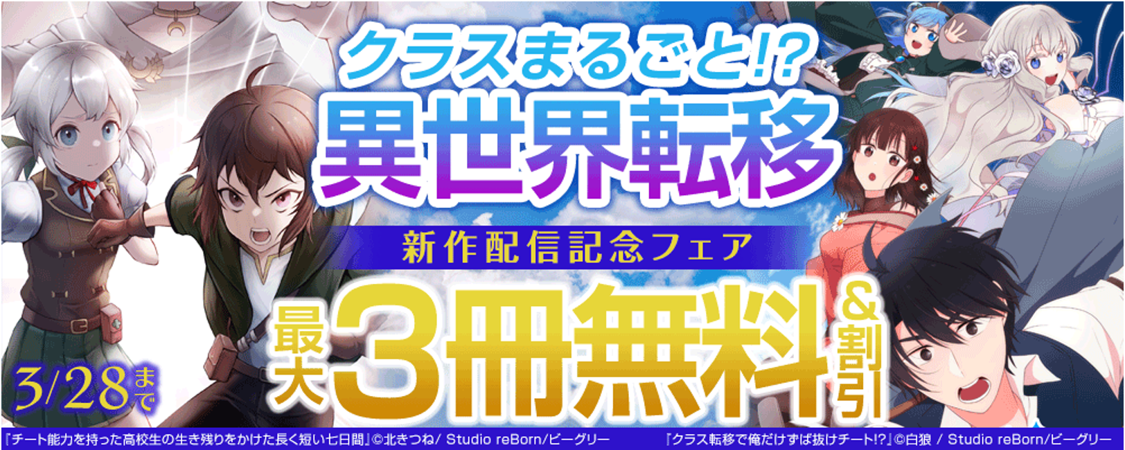 『まんが王国』にて、Studio reBorn制作の縦読みマンガ作品「チート能力を持った高校生の生き残りをかけた長く短い七日間」「クラス転移で俺だけずば抜けチート!?」の配信を開始いたしました。いずれもビーグリーが運営する小説投稿サービス『ノベルバ』に投稿された作品を原作としたコミカライズ作品です。また、新作の配信を記念し、最大3冊が無料で読めるキャンペーンも開催しております。