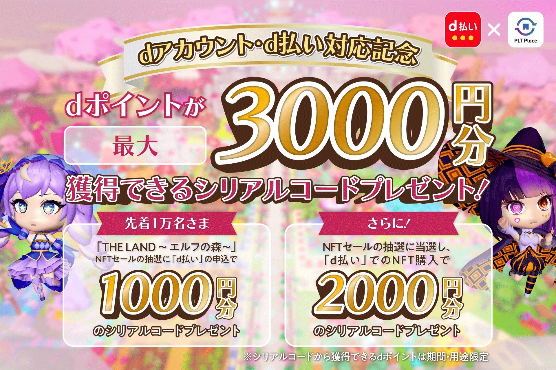 「PLT Place」の「dアカウント」「d払い」への対応を記念して、「d払い」で「THE LAND 〜エルフの森〜」 NFTセールの抽選にお申し込みいただいた方を対象にした、最大3,000円分の「dポイント」を獲得できるシリアルコードプレゼントキャンペーンを実施します。