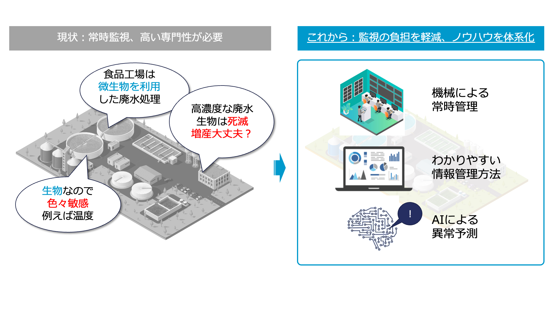 食品工場では大量の水を消費します。そして、適切に処理を行い無害化することが重要です。また、一度事故が起こると魚が死んだり、利水が停止したりと、場合によっては大きな影響が出ることがあります。このため、工場から河川への放流は水質に悪影響が及ばないように法律で厳しく基準値が定められています。高い専門性が求められることや、常時監視の必要性、季節などによる稼働条件が変わることなど、リスクを想定した運用体制構築が重要となります。