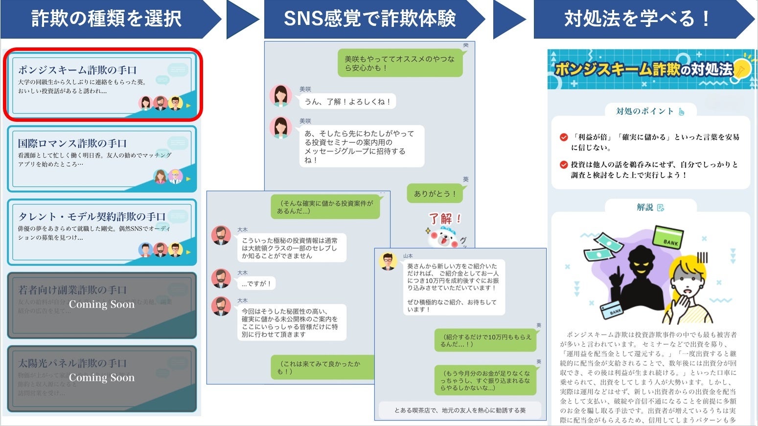 チャットの種類は、現在3種類を公開しておりますが、今後「若者向け副業詐欺」編や「太陽光パネル詐欺」編も順次公開する予定です。