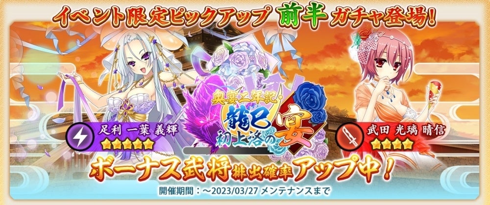 ▼期間限定『奥宴二年記・龍巳初上洛の宴』ピックアップ前半ガチャ開催中!
