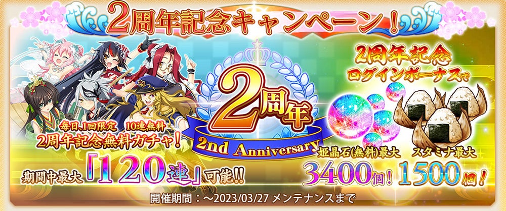 2023年3月23日をもってサービス開始2周年を迎える『戦国†恋姫オンライン ~奥宴新史~』にて『2周年記念キャンペーン&記念イベント』を開催いたします!