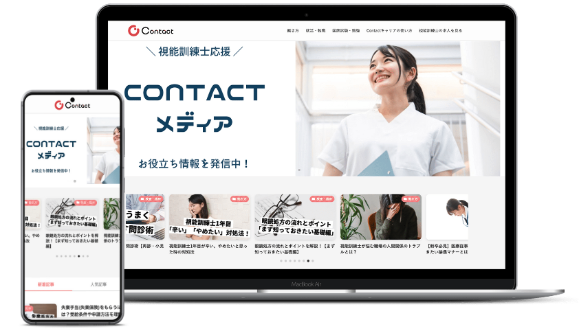 「Contact メディア」とは、視能訓練士に特化したお役立ち情報を発信するメディアです。現場に即した正確な情報を提供するため、弊社専属の現役視能訓練士ライターによって記事が執筆されています。