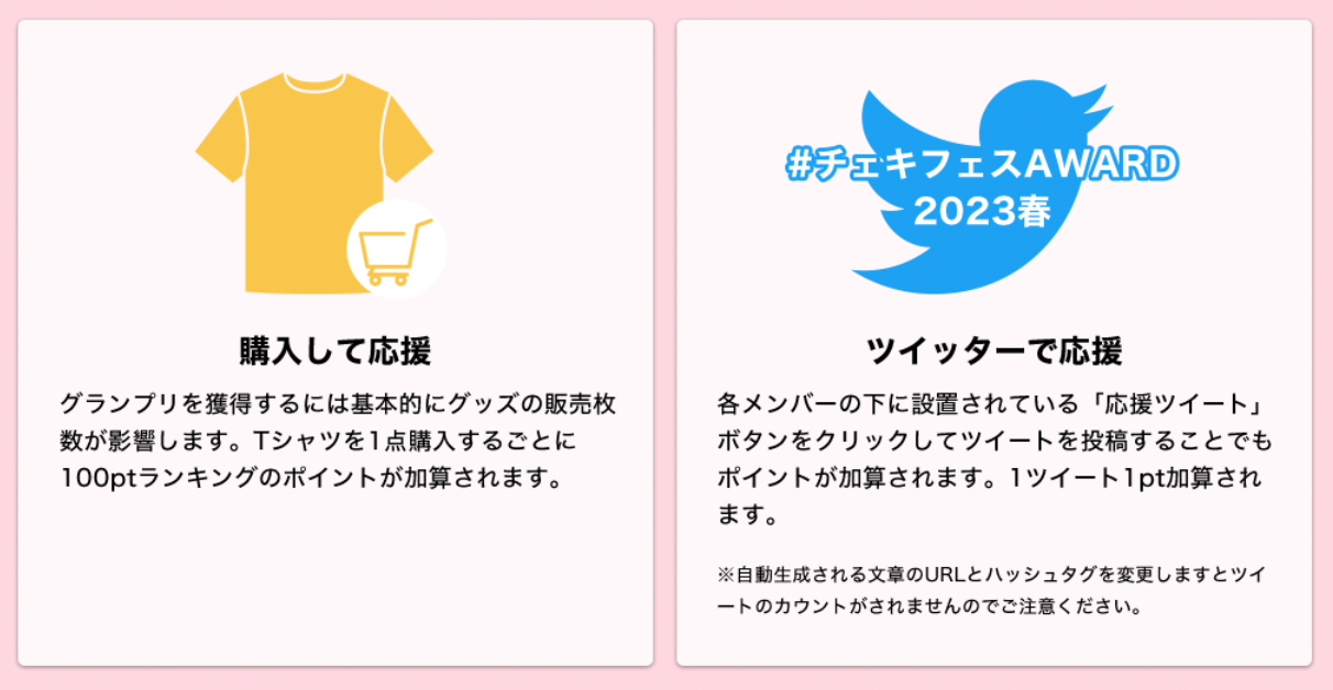 超チェキフェス参加の人気モデルの方々がTシャツをデザインして販売枚数と応援ツイート数の数でガチンコバトル!ランキングの上位入賞者には渋谷の街頭ヴィジョンに出演できるという豪華な賞品をご用意しています。あなたの応援で推しを渋谷のヴィジョンに出演させて未来のスターの活躍を後押ししよう!