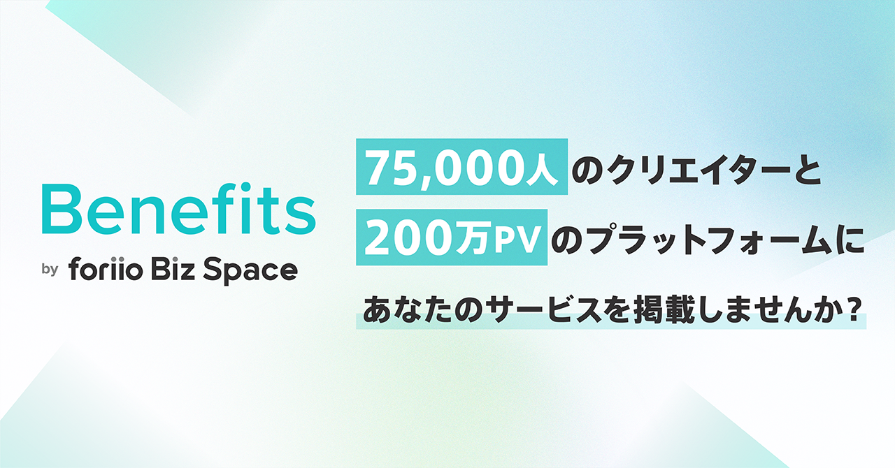 現在クリエイター登録者数75,000人、200万PVを誇る弊社「foriio」プラットフォーム内の『foriio Benefits』のサービスページにて、業務提携していただける企業様を募集しております。