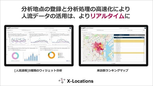 従来「POI(分析地点)の新規登録」を行うと、「POI登録リスト」で「登録済み」となるのは翌日の午前中以降と処理時間がかかっていました。この処理プロセスの改良により、人流データ分析プラットフォームLAPの5種類の「人流速報ウィジェット」(注1)では、新規POI(分析地点)の登録以降おおよそ3時間以内に新規POI(分析地点)が各分析ウィジェットで選択可能となり、分析結果が視覚化できるようになりました。その他のウィジェットでは新規POI(分析地点)の登録以降おおよそ3時間以内で「分析グループ」の作成が可能となるので、数分の「分析グループ」処理後、結果が表示されます。