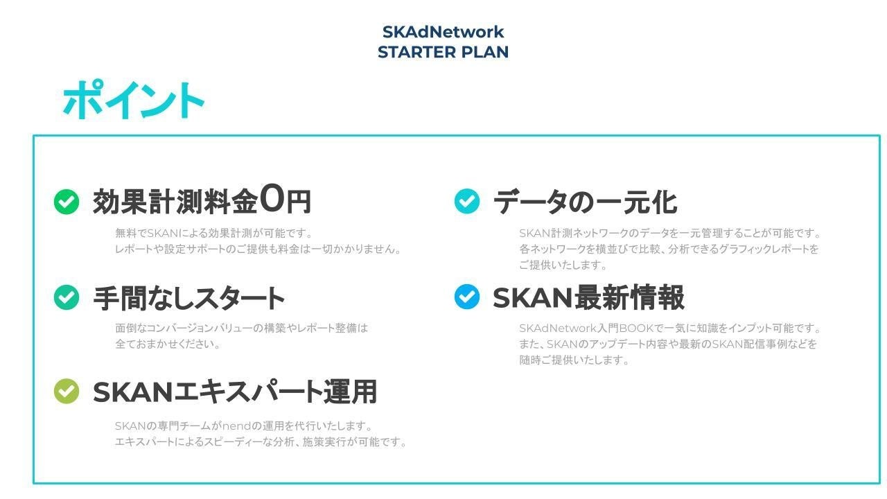 nendは、広告主企業様がプライバシーを重視したこれからの社会で、効率的なプロモーションを実現していけるよう、SKAdNetworkの導入や活用を個別でサポートする「SKAdNetwork STARTER PLAN」を開始いたしました。