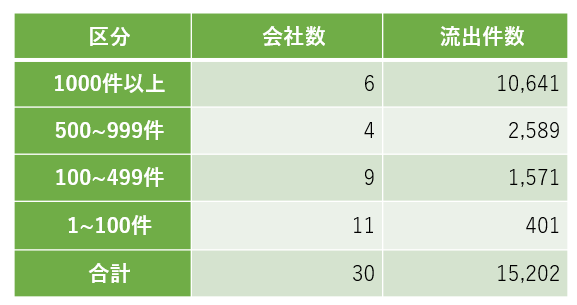– 流出したアカウント情報が1,000件以上の会社は6社、100件以上は13社、100件未満は11社