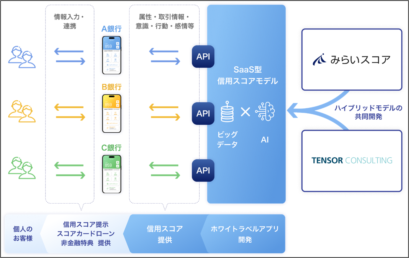 信用スコアサービスの導入にあたっては、信用度を見える化する「信用スコアモデル」の開発が必要となりますが、みらいスコアとテンソルが両社の知見や経験を結集しAIを活用した精度の高い信用スコアモデルを共同で開発し、SaaS(Software as a Service)としてご提供致します。これにより、金融機関のお客様は、自らスコアモデルを保有しなくても、SaaS利用料だけで信用スコアサービスの導入が可能となり、さらにホワイトラベルのアプリを利用することで、初期投資を抑えながら短期間かつ簡単に信用スコアを活用したスコアカードローンなどを提供することが可能となります。