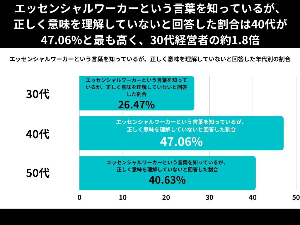 【エッセンシャルワーカーという言葉を知っているが、正しく意味を理解していないと回答した割合は40代が47.06%と最も高く、30代経営者の約1.8倍】