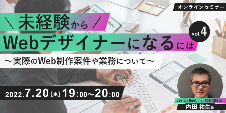 使いやすさや見た目など、Webサイトのデザイン制作を担当するWebデザイナー。近年、未経験からWebデザイナーをめざす方が増えてきています。一方で、Webデザイナーに求められるスキルや知識がわからず、「どうしたらWebデザイナーになれるのか」と迷われている方も少なくありません。本セミナーは、そんなお悩みを持つ未経験の方々に向けてWebデザイナーになるための情報をお伝えするセミナーシリーズです。