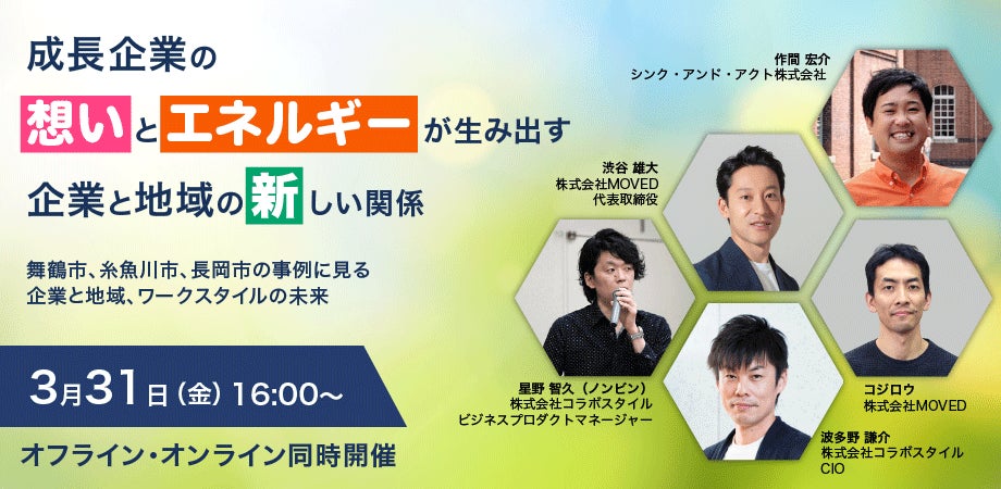 このイベントでは、京都府舞鶴市、新潟県長岡市、新潟県糸魚川市という異なる3つの地域で活躍するメンバーが集まり、企業・団体と地域の新しい関わり方の実践事例をご紹介すると共に、登壇者4人のパネルディスカッションで、新しい関わりによって生まれる新たな価値やワークスタイルの未来について考えます。