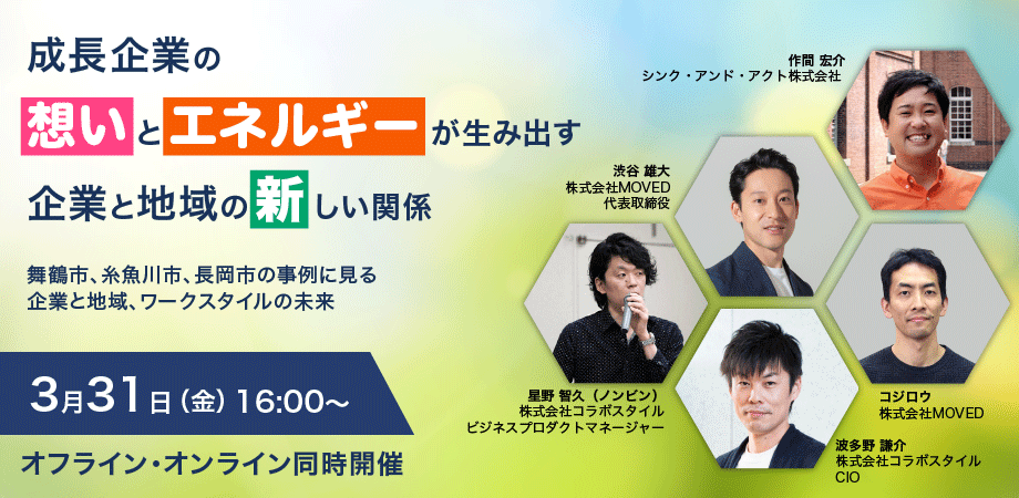 このイベントでは、京都府舞鶴市、新潟県長岡市、新潟県糸魚川市という異なる3つの地域で活躍するメンバーが集まり、企業・団体と地域の新しい関わり方の実践事例をご紹介すると共に、登壇者4人のパネルディスカッションで、新しい関わりによって生まれる新たな価値やワークスタイルの未来について考えます。