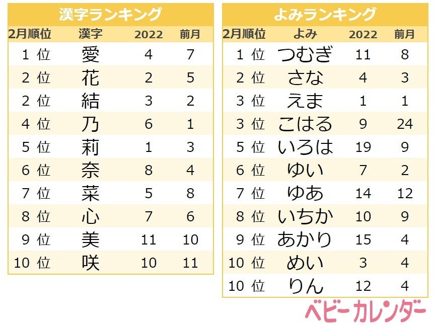 < 2 月生まれ >女の子に人気の名前の漢字・よみランキング