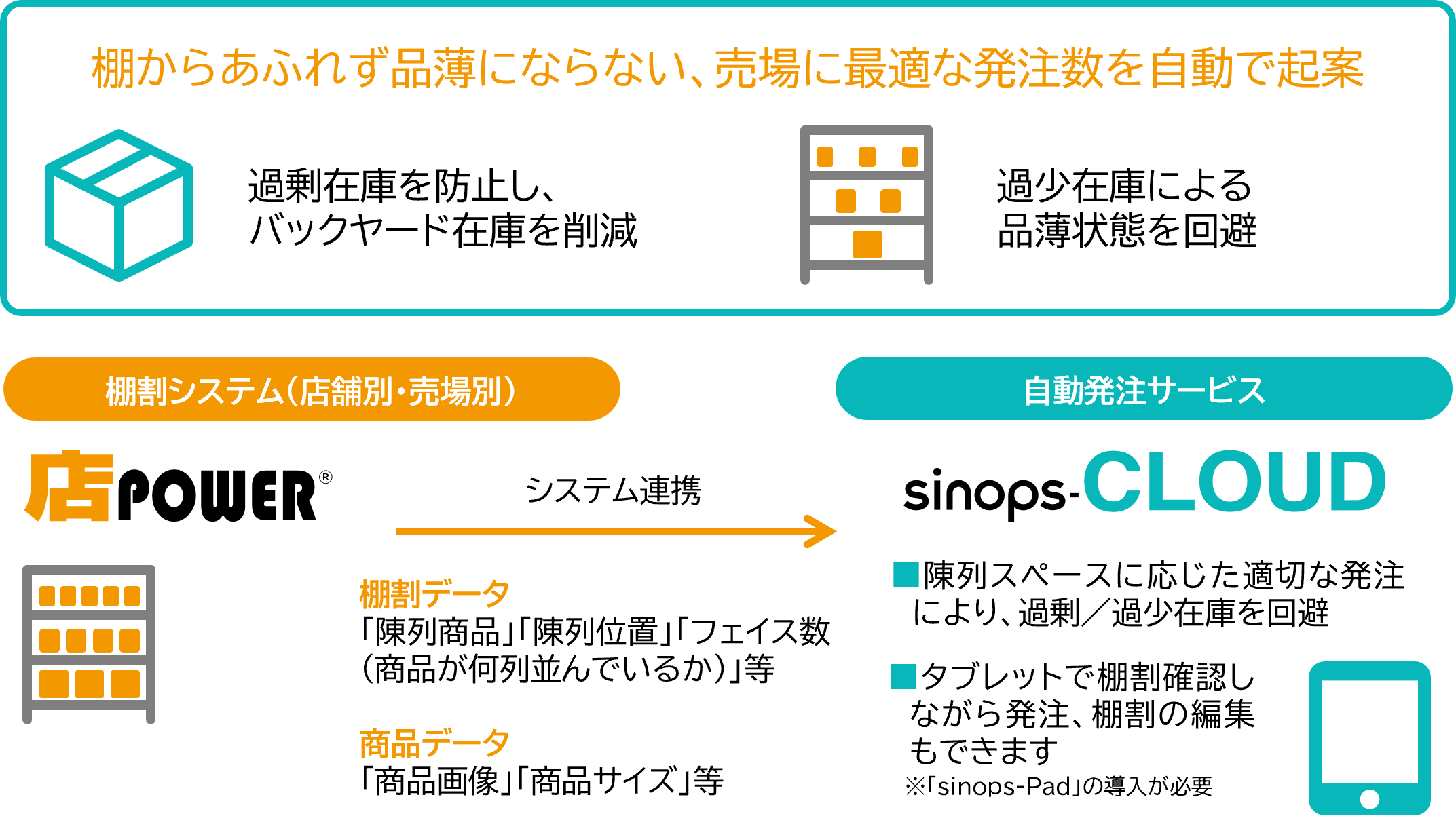 「店POWER」がもつ店舗別、売場別の陳列商品、陳列位置、フェイス数等の棚割データを、直接「sinops-CLOUD」へ連携します。陳列可能数を考慮した適切な発注により過剰在庫を抑制するほか、フェイス数に基づく発注数の算出により、過少在庫による品薄状態を回避できます。