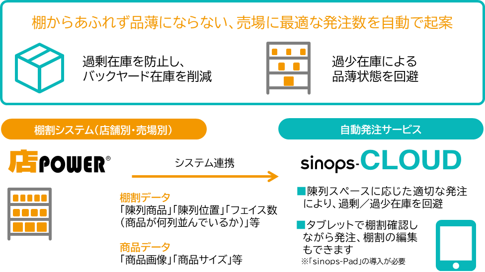 株式会社シノプス(本社:大阪市北区、代表取締役:南谷 洋志、以下シノプス)と株式会社サイバーリンクス(本社:和歌山県和歌山市、代表取締役社長:村上 恒夫、以下サイバーリンクス)は、シノプスが提供する需要予測型自動発注サービス「sinops-CLOUD(しのぷすくらうど)」と、サイバーリンクスが提供する棚割管理システム「店POWER(みせぱわー)」の連携を、2023年2月より開始いたしました。自動発注システムに必要な棚割データ連携にかかる導入期間の短縮を実現いたします。