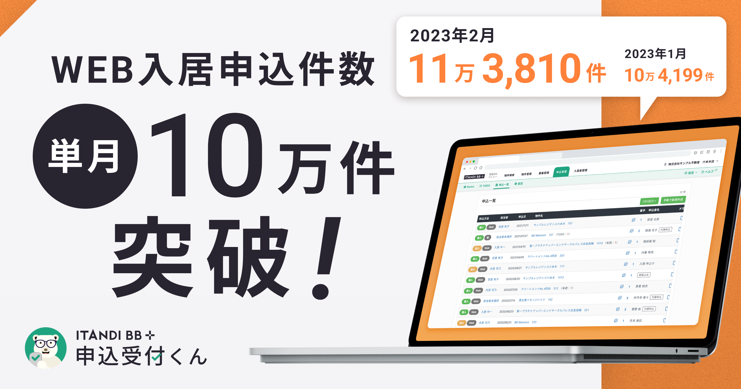 この度、「申込受付くん」による賃貸物件のWEB入居申込件数が、2023年1月度 約10.4万件、2月度 約11.3万件となり、両月ともに単月で10万件を超え過去最高の月間WEB入居申込件数を記録しました。