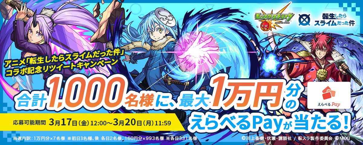 また、コラボ開始と合わせて「えらべるPay」が当たるアニメ「転生したらスライムだった件」コラボ記念リツイートキャンペーンも実施します。