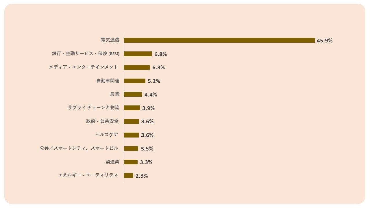 産業別では、通信産業が45.9%と最も高い市場シェアを占めています。インドの通信ネットワークは、電話利用者数(固定電話、携帯電話含む)で世界第2位です。巨大な通信会社による激しい競争により、世界で最も低い通話料金を誇っています。
