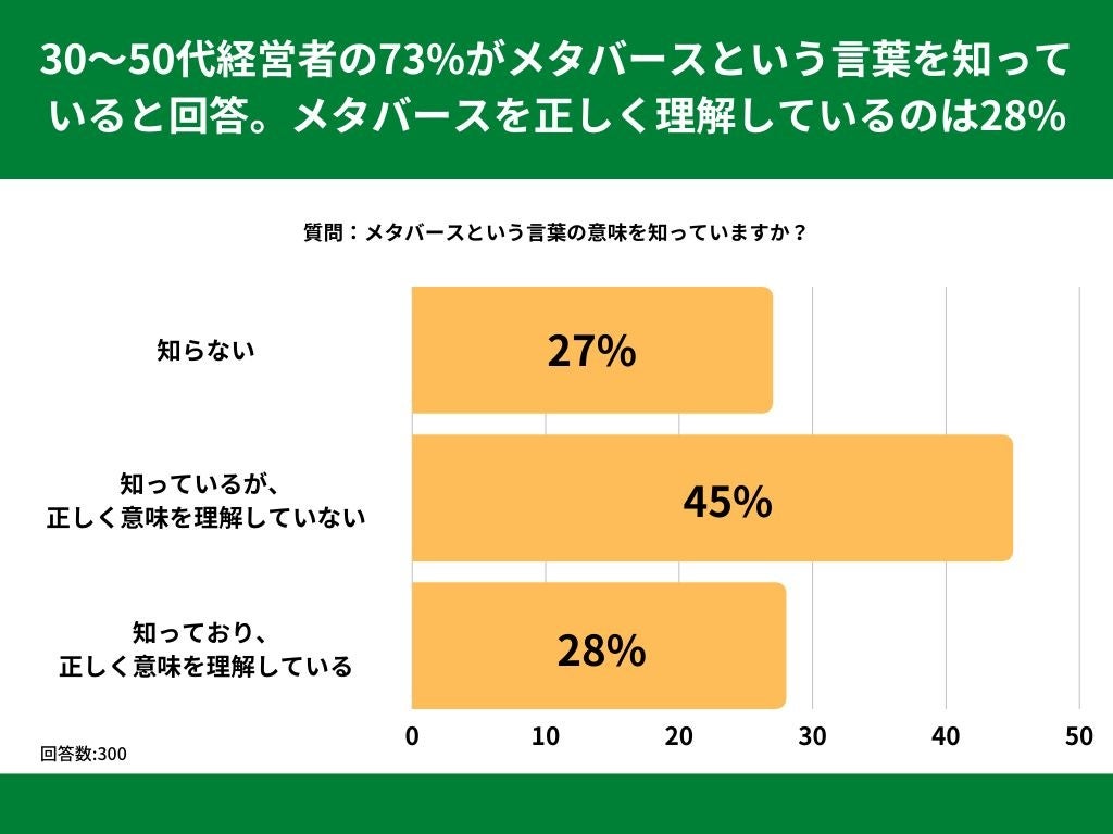 40代経営者の3割以上の方がメタバースという言葉を知っており、正しく意味を理解していることが分かりました。