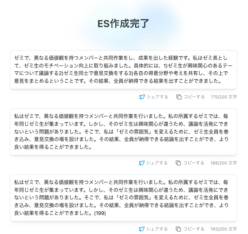 このサービスを利用することで、ESの書き方に悩む学生、文章の書き出しや構成に悩んでいる、書くのが面倒だと考えている学生、そして絶賛就活中の学生にとって一筋の光となれば幸いです。