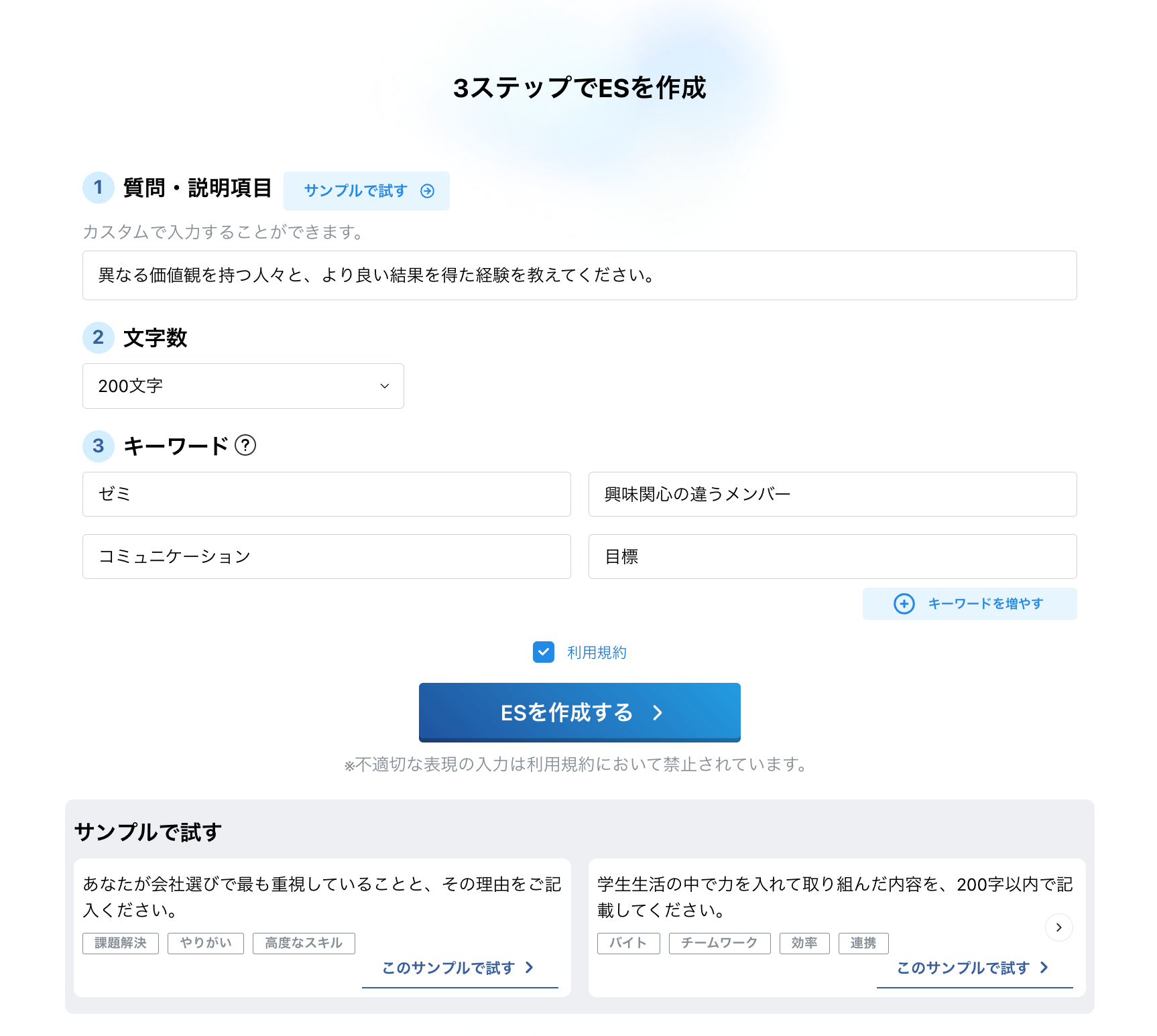 「ES Maker」は、6万枚以上の優秀なエントリーシートを学習したAIに、質問・キーワード・文字数を入力することで、お手本となるようなESの文章を作成してくれます。最近話題のAI系ツールよりも、就活生・ESに特化しているのが特徴です。