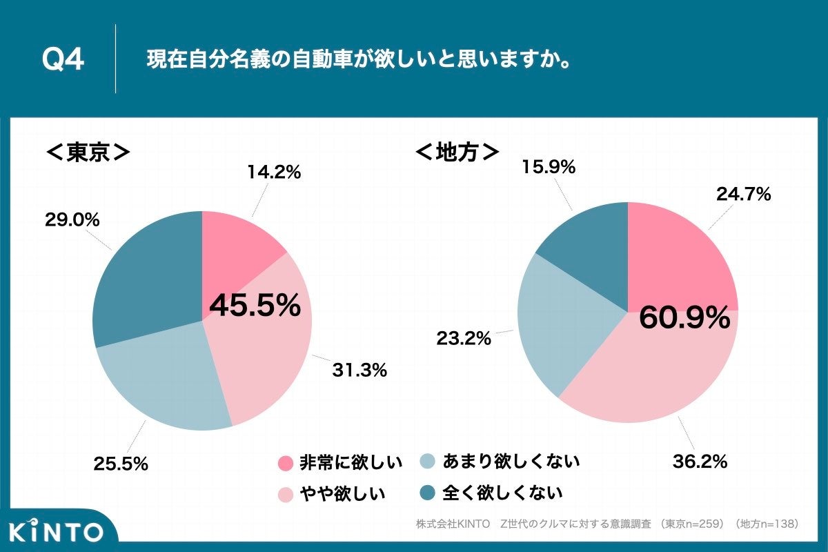 - Q4.「自分名義の自動車が欲しい」都内Z世代45.5%、地方Z世代60.9%、が欲しいと回答