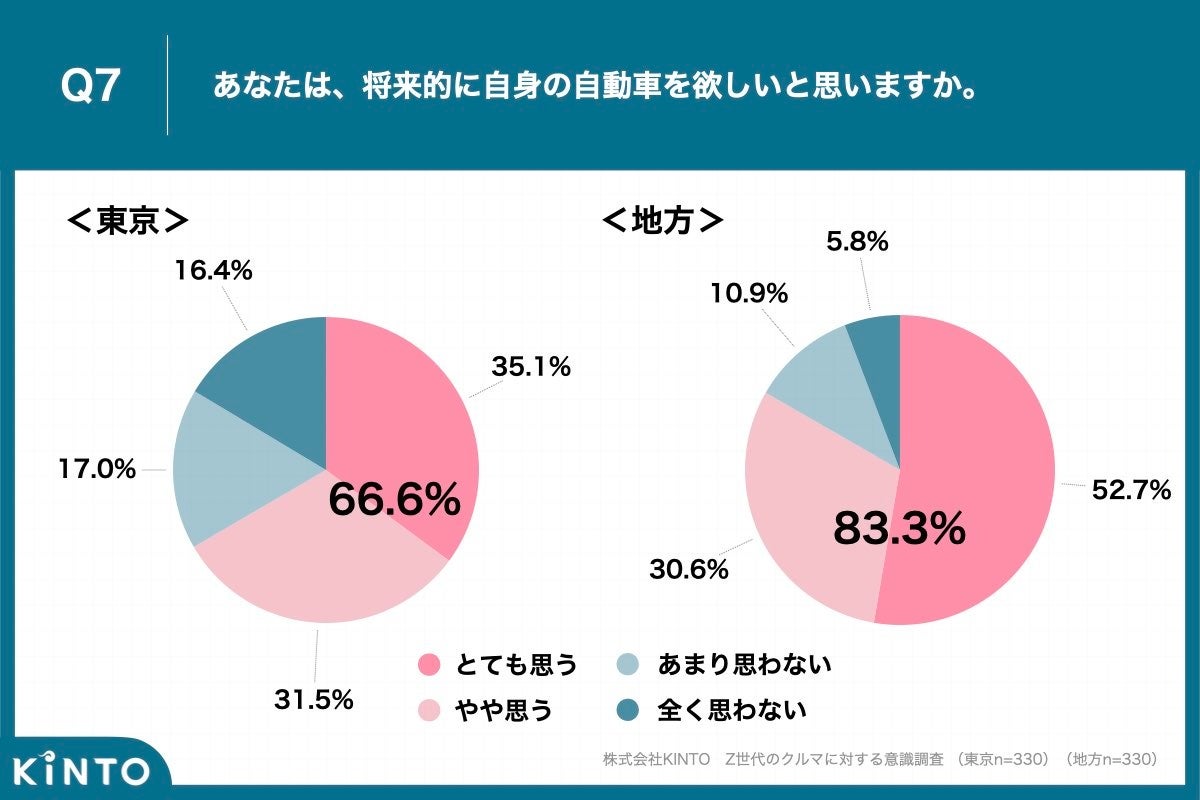 - Q7. 都内の66.6%が「将来的に自身の自動車を欲しい」と回答、地方は83.3%と都内より16.7ポイント高い結果に