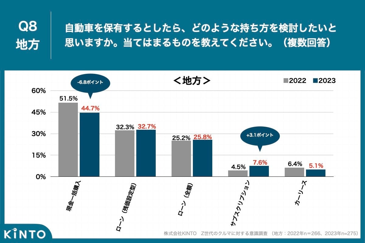 地方在住のZ世代は「現金一括購入」が44.7%と昨年比で7ポイント近く下げた一方、「サブスクリプション」が7.6%と昨年比で約3ポイントの増加となりました。