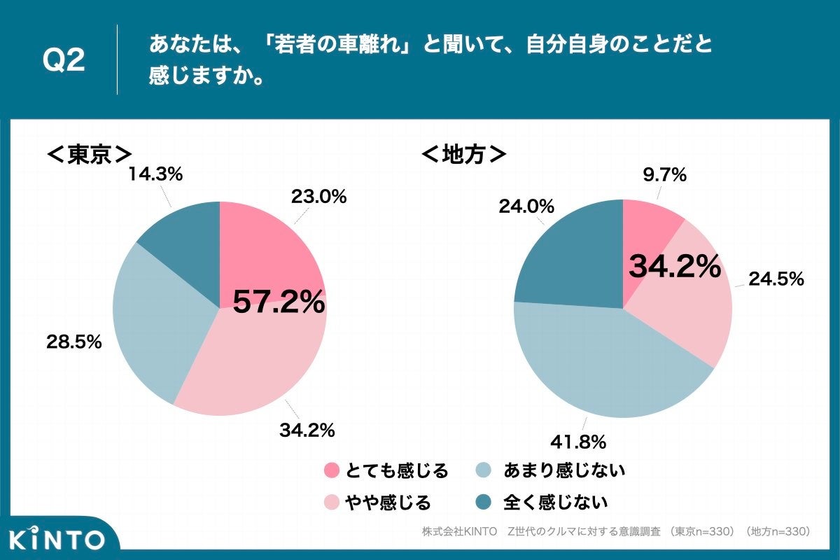 - Q2. 都内Z世代の約6割が「若者の車離れ」を実感する一方で、地方では34.2%と23ポイント低い結果に
