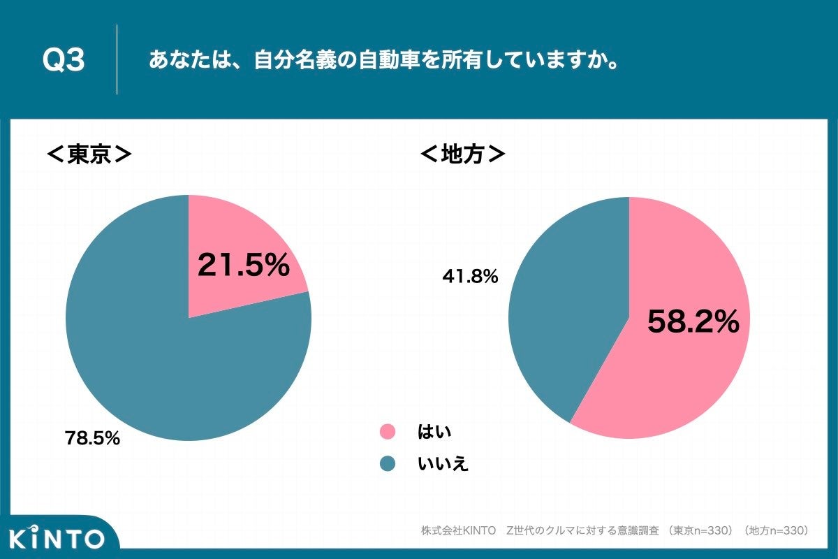 「Q3.あなたは、自分名義の自動車を所有していますか。」と質問したところ、都内在住のZ世代は「はい」が21.5%、「いいえ」が78.5%、地方在住のZ世代は「はい」が58.2%、「いいえ」が41.8%という回答となりました。
