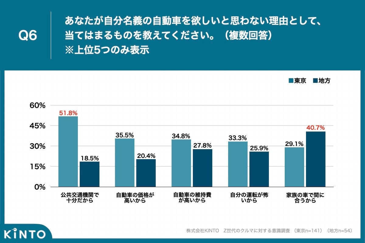 - Q6. 自分名義の自動車が欲しくない理由、都内は「公共交通機関で十分だから」が51.8%で最多、地方は「家族の車で間に合うから」が40.7%で最多