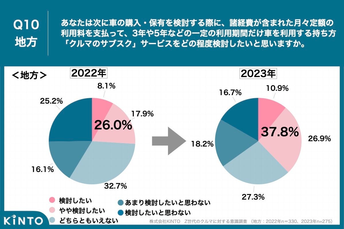 Q7で将来的に自身の自動車を欲しいと回答した方に、「Q10.あなたは次に車の購入・保有を検討する際「クルマのサブスク」サービスをどの程度検討したいと思いますか。」と質問したところ、都内在住のZ世代は「検討したい」が19.1%、「やや検討したい」39.5%、合計58.6%で昨年比17.4%の増加となりました。また、地方在住のZ世代は「検討したい」が10.9%、「やや検討したい」が26.9%、合計37.8%で昨年比11.8%の増加という結果となりました。