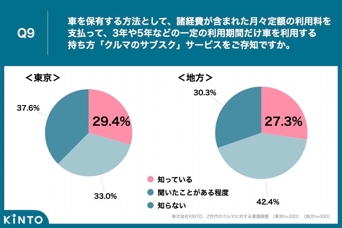 「Q9.車を保有する方法として「クルマのサブスク」サービスをご存知ですか。」と質問したところ、都内在住のZ世代は「知っている」が29.4%、「聞いたことがある程度」が33.0%、地方在住のZ世代は「知っている」が27.3%、「聞いたことがある程度」が42.4%という回答となりました。