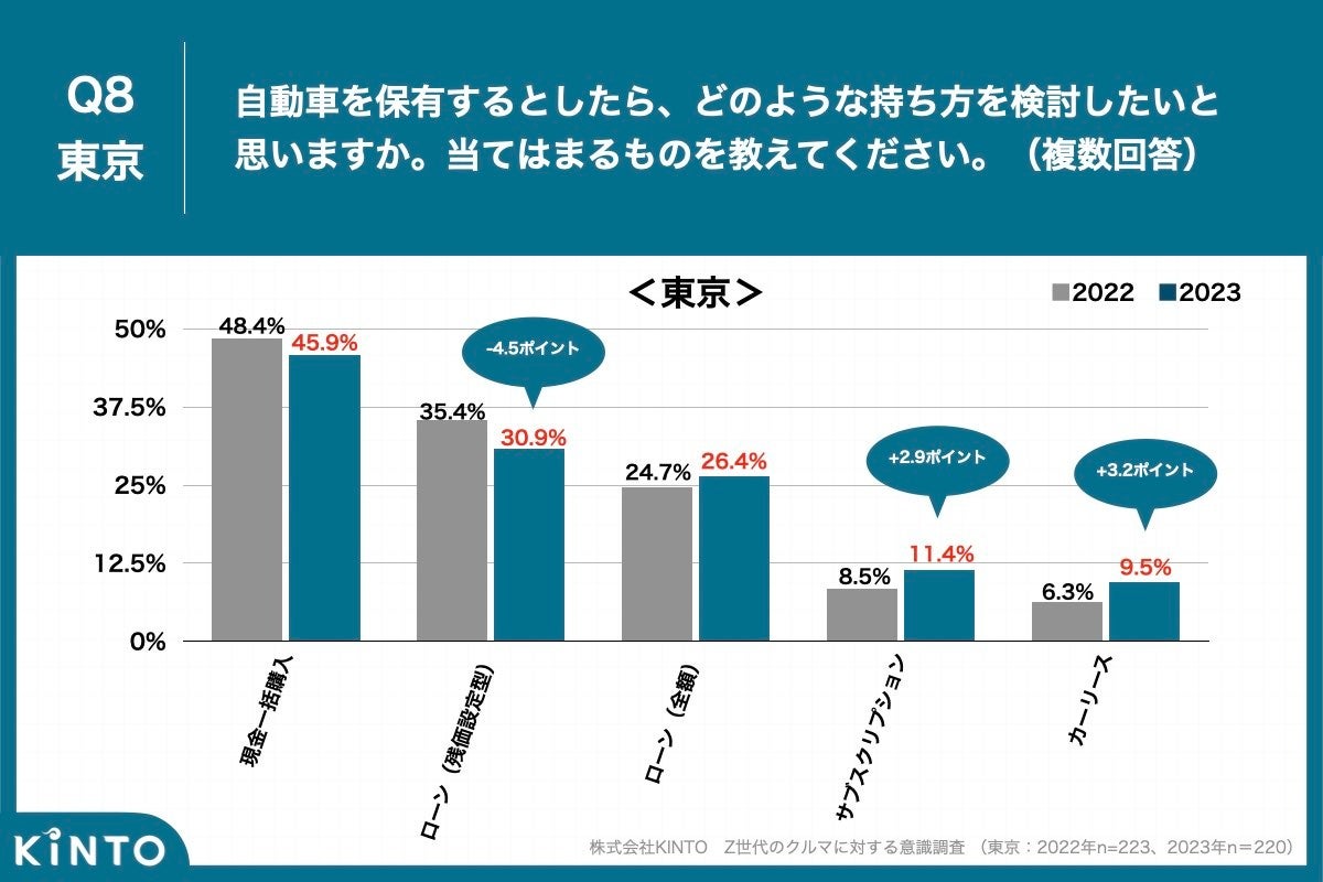 Q7で将来的に自身の自動車を欲しいと回答した方に、「Q8.自動車を保有するとしたら、どのような持ち方を検討したいと思いますか。」と質問したところ、都内在住のZ世代は「現金一括購入」が45.9%、「ローン(残価設定型)」が30.9%と昨年比で減少する一方、「サブスクリプション」が11.4%、「カーリース」が9.5%と、昨年比で約3ポイントの増加となりました。