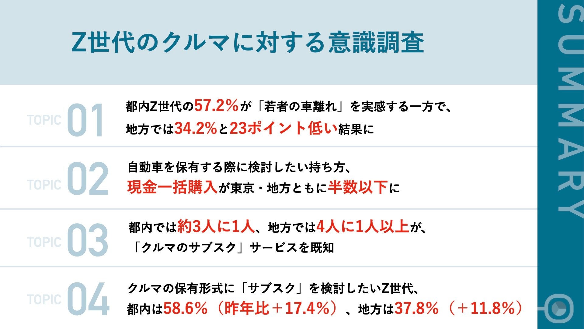 都内在住のZ世代の約6割が「若者の車離れ」を実感する一方で、地方では「若者の車離れ」を感じるZ世代は34.2%と23ポイント低い結果となり、6割以上の地方在住のZ世代が「自分名義の自動車が欲しい」と回答しました。一方で、都内では約3人に1人が「クルマのサブスク」サービスを知っていることが明らかになり、クルマの保有形式に「サブスク」を検討したいZ世代は都内のZ世代は地方より20.8ポイント高い結果となりました。