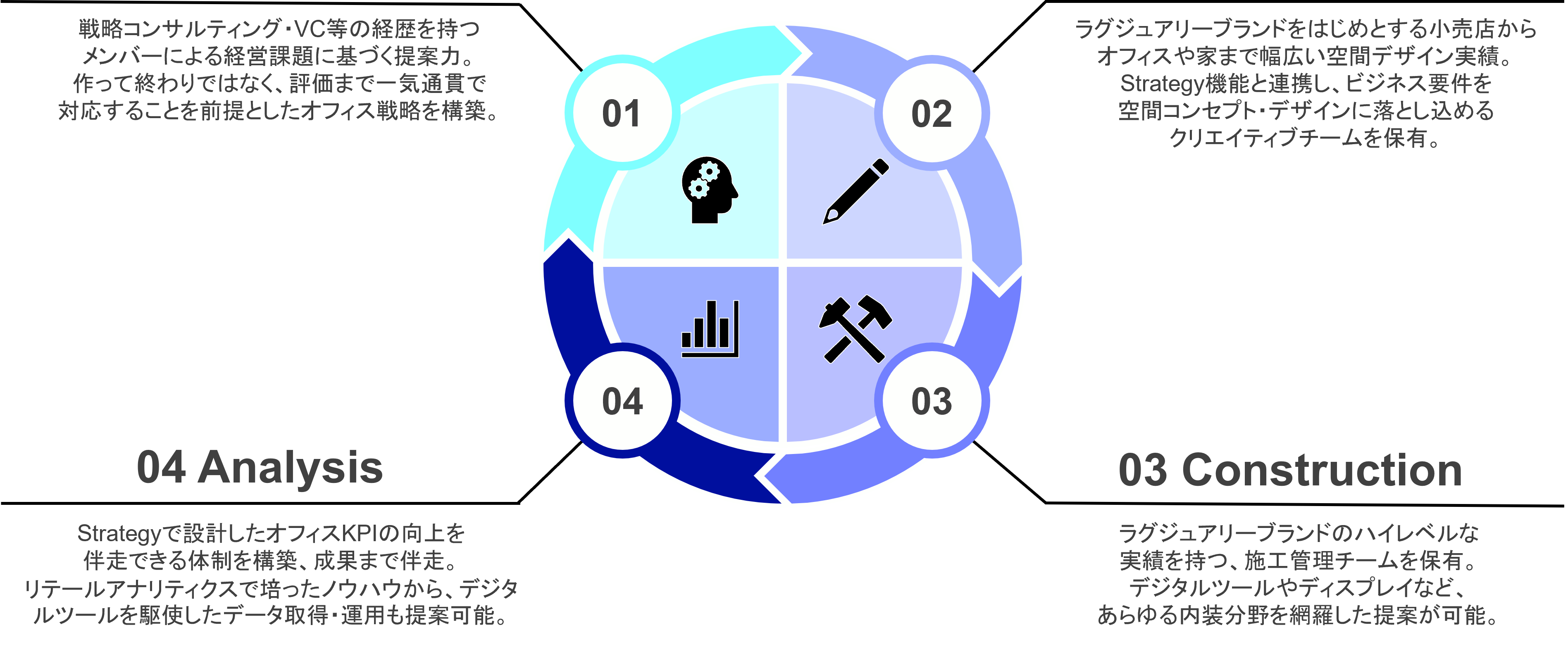 「SHOWBASE」では、事業戦略に必要なKPIや企業理念を熟知した上で、空間コンセプトを設計し、空間デザイン・施工を行います。完成したオフィス空間は、社員のエンゲージメント向上やコミュニケーション促進など、組織力の向上に加えて、事業ショーケースとしての機能も果たし、顧客やビジネスパートナーに企業の強みをアピールする場としても活用できます。また、「SHOWBASE」では、オフィス完成後も定期的なKPIの振り返りや改善提案、必要に応じた再設計・改装などのアフターサポートを行うことで、顧客企業の事業成長をサポートします。