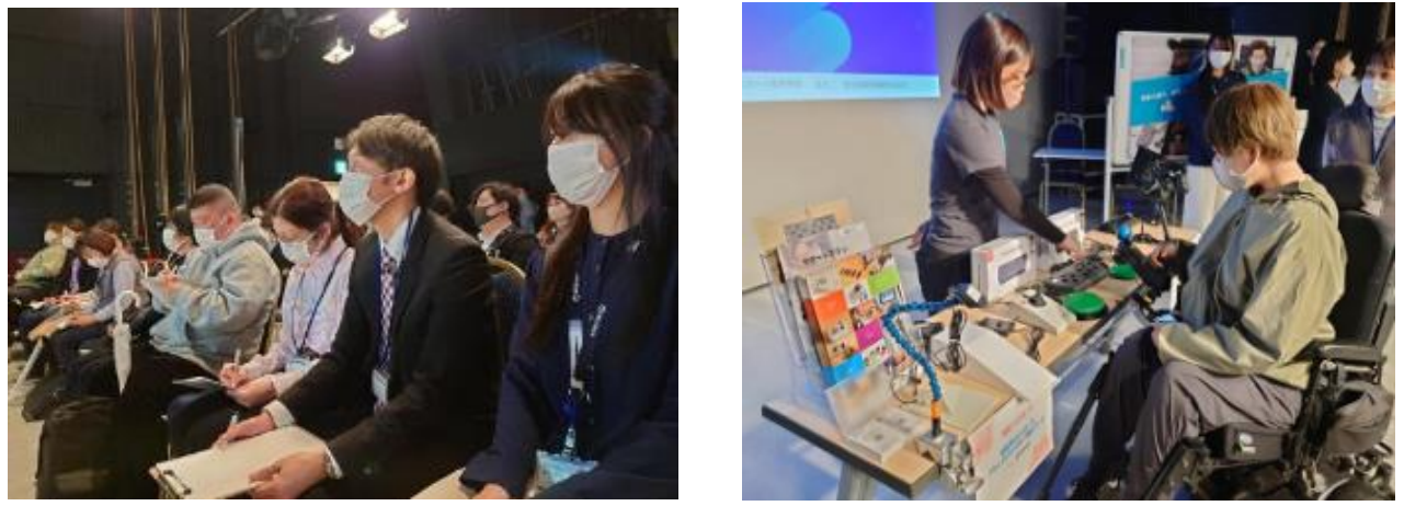 パネルディスカッションに聞き入る参加者 福祉用のコントローラーの展示