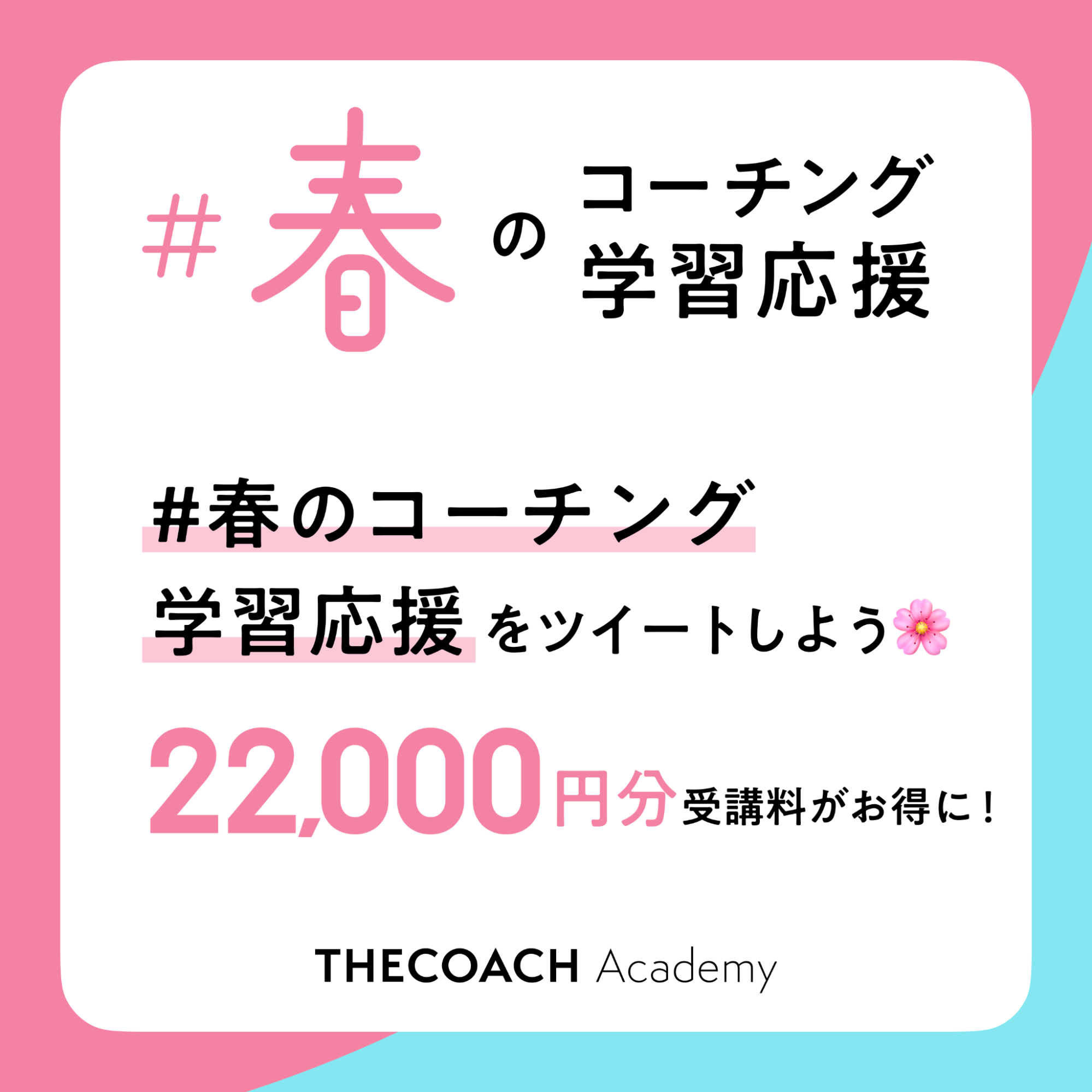 期間内に、THE COACH Twitterアカウントをタグ付け、ハッシュタグ「#春のコーチング学習応援」を付けて投稿していただいた方に、受講料22,000円(税別)がお得になるチャンス
