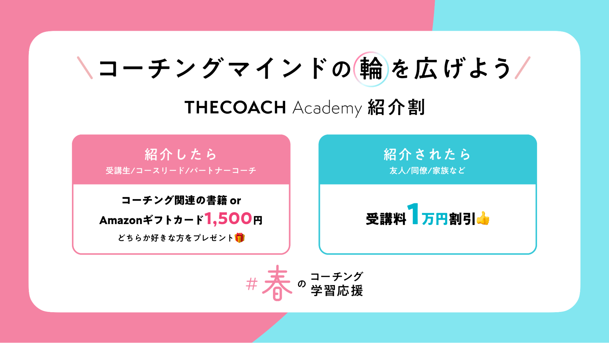 THE COACH Academyでは、これまで700名以上の方に受講いただいております。過去にTHE COACH Academyで学んだ受講生からご家族・ご友人にTHE COACH Academyを紹介いただき、紹介された人がTHE COACH Academy基礎コースへの受講を申し込むとそれぞれ以下の特典がもらえます。