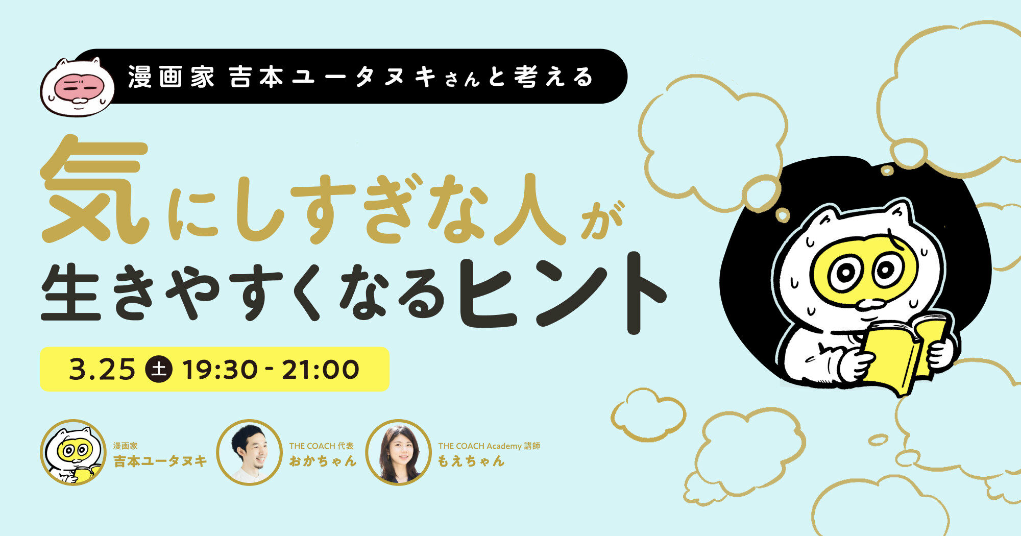 ゲストにお迎えするのは、『気にしすぎな人クラブへようこそ』の著者である漫画家吉本ユータヌキ(https://twitter.com/horahareta13)さん。THE COACH Academyの受講生でもある吉本さんに、コーチングを学んでどのような変化がご自身に起きたのかや、本の執筆に至った背景について伺います。