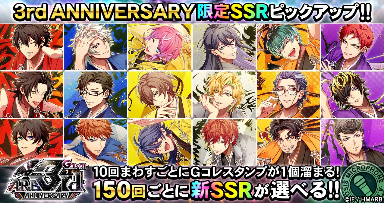 3rd ANNIVERSARYを記念し、和服に身を包んだ6ディビジョン全18キャラクターの描き下ろしカード【3rd Anniv.】シリーズが手に入るGコレクトを開催します。ディビジョン別に6つのGコレクトが登場し、3rd Anniv. Gコレチケット各種またはジェムで回すことができます。