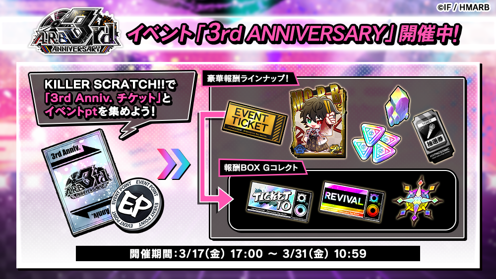 今回のイベントでは、KILLER SCRATCH!!をプレイしてイベントptや「3rd Anniv. チケット」を集めることで、3rd ANNIVERSARYを記念した描き下ろし限定のちびキャラのSRカード【3rd あにばーさりー】シリーズ、過去のストーリーイベントGコレクト限定SSRカードが当たるGコレクトが回せる「SSR確定復刻ストーリーGコレチケット」や「3rd Anniv. Gコレチケット:10回」「スペシャルスキルスター:SSR」など豪華報酬を獲得することができます。