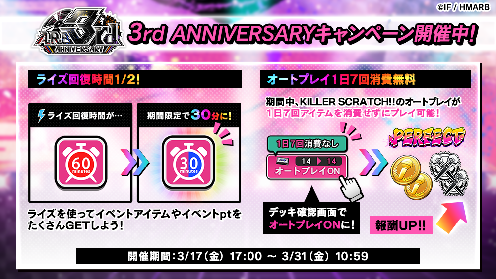 期間中、KILLER SCRATCH!!で使用できるライズの回復にかかる時間が通常の1/2になり、オートプレイが1日7回までアイテムを使用せずに利用できます。