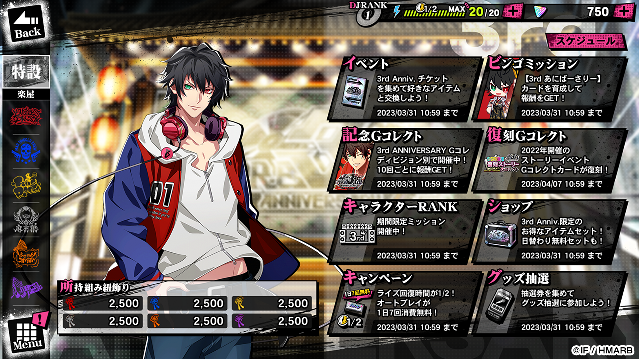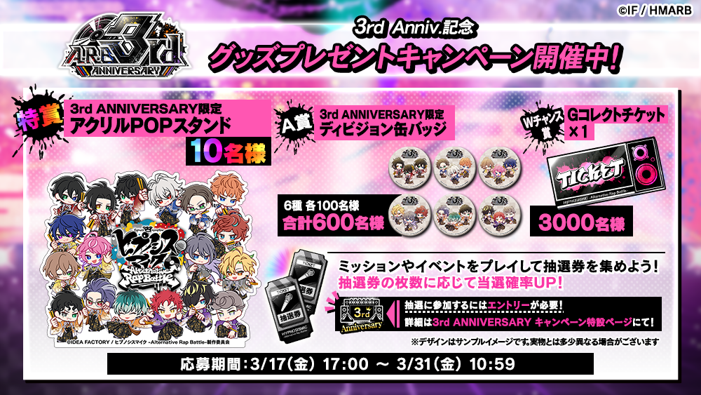 ゲームアプリ内では期間中、3rd ANNIVERSARYを記念した特設ページが登場!自分だけのステージを作り上げることができるイベント「3rd Anniv. Festival Stage」開催のほか、ログインボーナスや限定ミッションの実施など、ヒプマイ -A.R.B-をより一層楽しんでいただくための特別なキャンペーンを行っております。