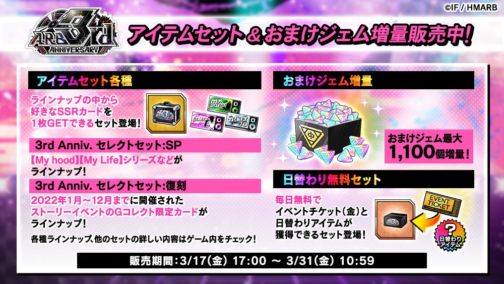 シート上に記載されたミッションをそれぞれクリアしたり、シートをすべてクリアしたりすることで、【3rd あにばーさりー】シリーズのカードや「3rd Anniv. Gコレチケット」などが獲得できます。