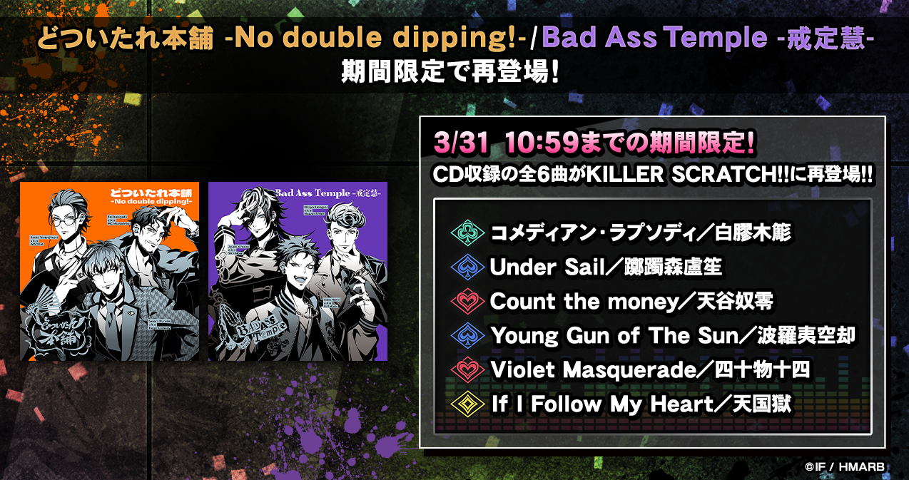 『どついたれ本舗 -No double dipping!-』『Bad Ass Temple -戒定慧-』に収録されているオオサカ・ディビジョンとナゴヤ・ディビジョンのソロ曲全6曲が期間限定でKILLER SCRATCH!!に再登場します。