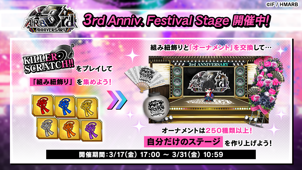 期間中、KILLER SCRATCH!!をプレイして「組み紐飾り」を集め、「オーナメント」と交換することで、イベントマイルームのステージを飾り付けることができます。ディビジョン毎のオーナメントのほか、期間中にその他のオーナメントも随時追加されますのでどうぞお楽しみに。